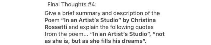 . And find homework help for other Christina Rossetti questions at eNotes. In an Artists Studio can be also be seen as Rossetti offering a critique of artists objectification of women in art. I hope to share with you quality questions today so that you.